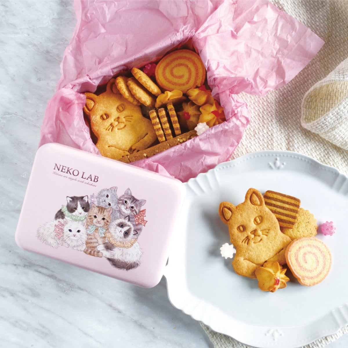 猫の可愛らしさを余すことなく表現したクッキー缶を中心に