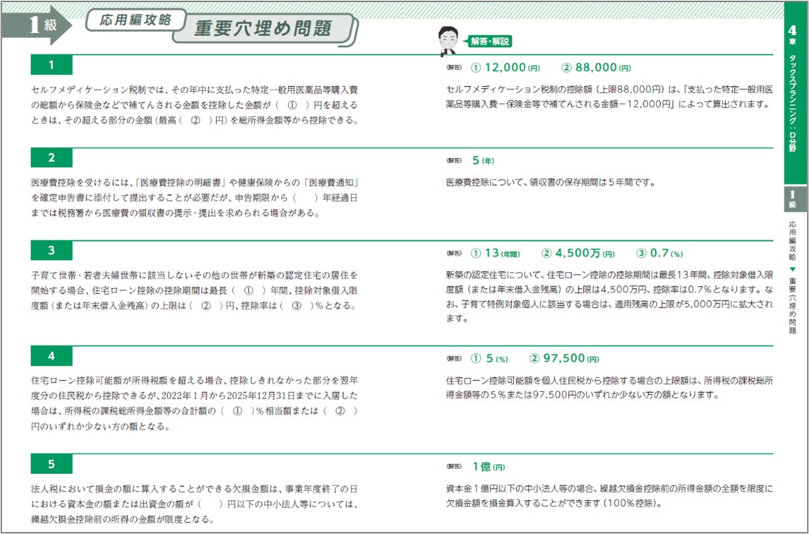 近年の応用編の出題ではニッチなテーマも多く、一般の受検生では解くことができない、いわゆる「重箱の隅」問題も多く見受けられます。本書では過去2回以上出題された重要な穴埋め問題に絞って掲載。追加の得点アップに向けて、重要な数値・単語の確実な習得を目指します。