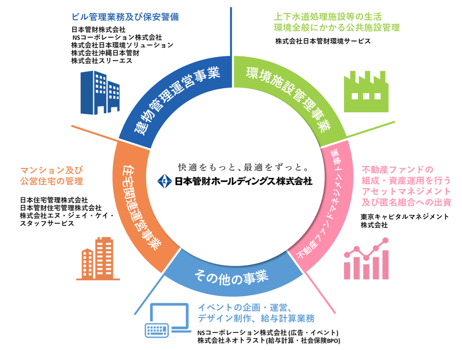 事業内容:オフィスビル、集合住宅、環境施設等の管理運営事業や不動産ファンドマネジメント事業等を営むグループ会社の経営管理及びこれに附帯又は関連する業務