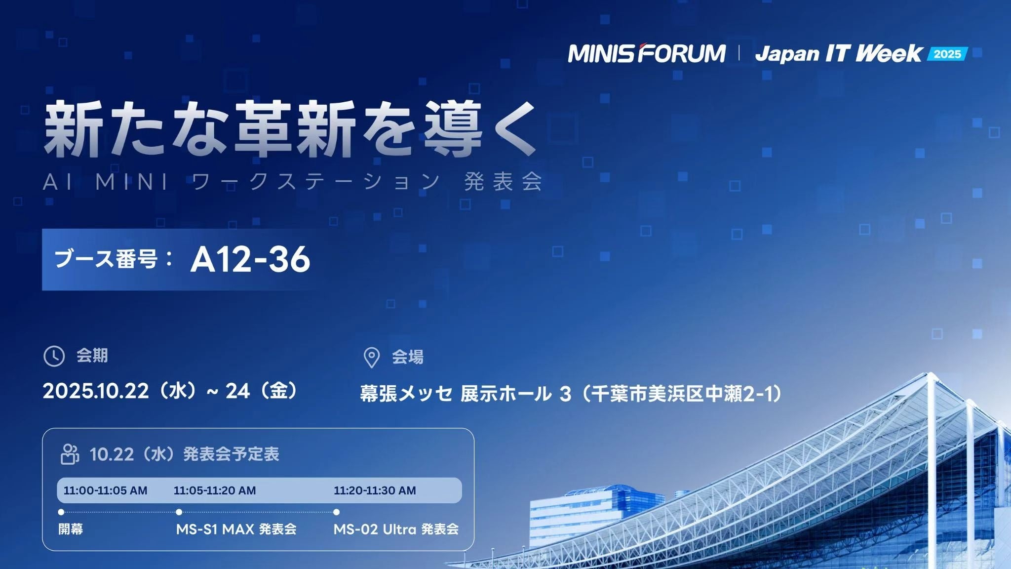 MINISFORMは、2025年10月22日~24日に幕張メッセで開催の展示会「Japan IT Week【秋】2025」(3ホール A12-36)に出展することをお知らせします。