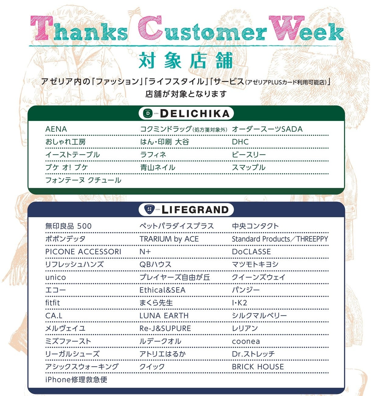 期間中、ファッション・ライフスタイル・サービスの対象店舗でお買い物されたお客様にお買い上げ金額に応じてアゼリアPLUSポイントをプレゼントいたします。