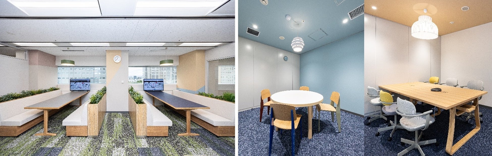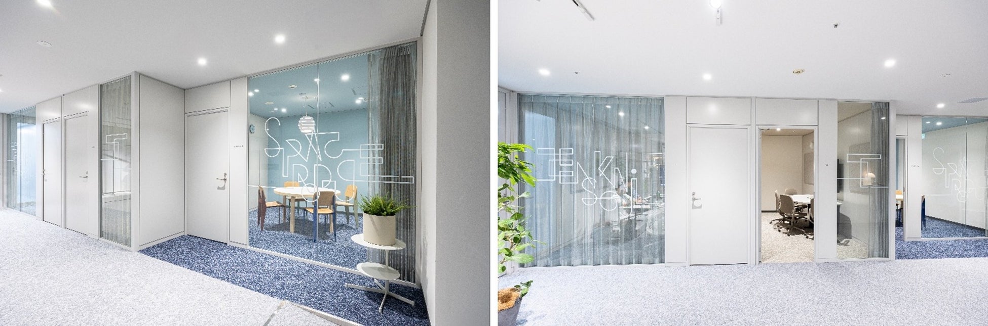 新オフィスは、延床面積約580㎡(約175坪)と旧オフィスから1.5倍拡大し、75~80席を配置しています。会議室は、当社主力となる店舗什器の商品名を冠した5室を設け、ミーティングエリアを4区画確保しました。自席以外で集中作業ができる個人用ブースや完全個室ブースを新設し、用途別ゾーニングで構成。休憩・打ち合わせ・イベント利用が可能な「Lounge」には大型モニターを設置し、大阪本社や全国拠点とのオンラインコミュニケーションツールとしても活用します。エントランス兼エキシビジョンエリアでは、企業ビジョンを表現した大画面グラフィックをダイナミックに掲出しながら、その時々の新商品やプロモーション商品を展示し、社外ブランディングと情報発信の拠点とします。執務エリアでは当社オリジナル家具や100%子会社の家具ブランド「ENEN(エネン)」の製品を配し、多様な働き方を支える快適な動線とデザイン性を両立。社員のエンゲージメント向上と創造性の醸成を図ります。