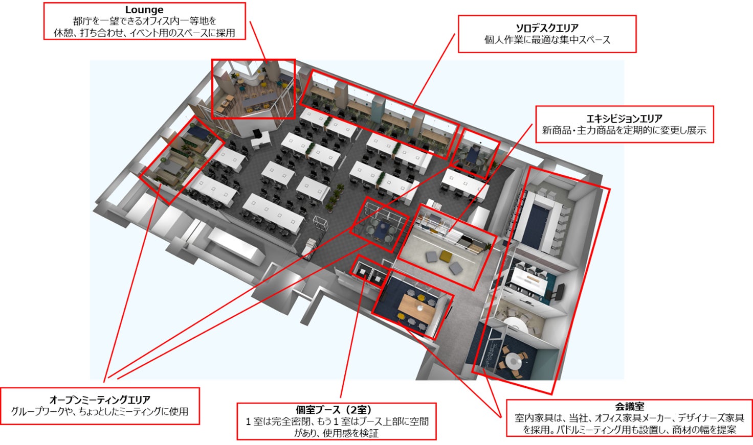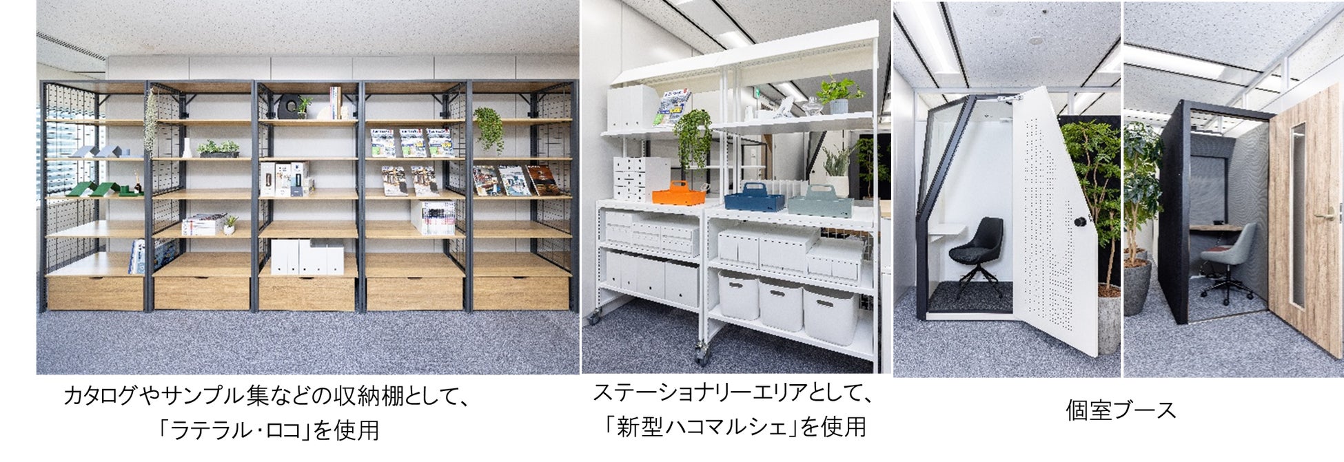 当社オリジナルの什器やオフィス家具の使用イメージを提案する、ショールーム型オフィスへ