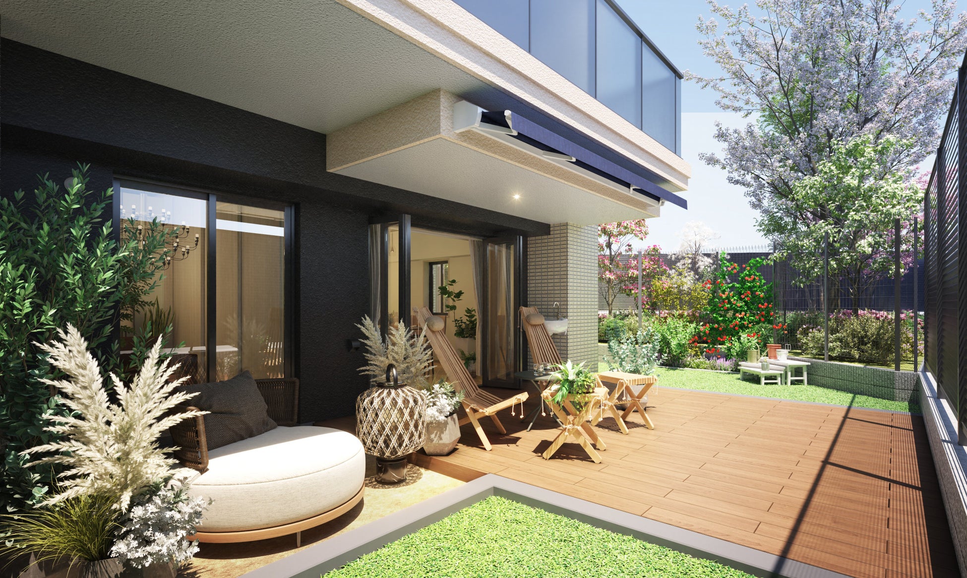 本物件は全42邸、2LDK〜3LDK で55㎡台~80㎡台・20タイプバリエーションの多彩なプランを展開。ルーフバルコニー付住戸、また1Fにはオープンエアリビング住戸などを用意し、家族が永く、心地よく暮らし続けるために、空間の広がりと用途の多様性を追求しました。