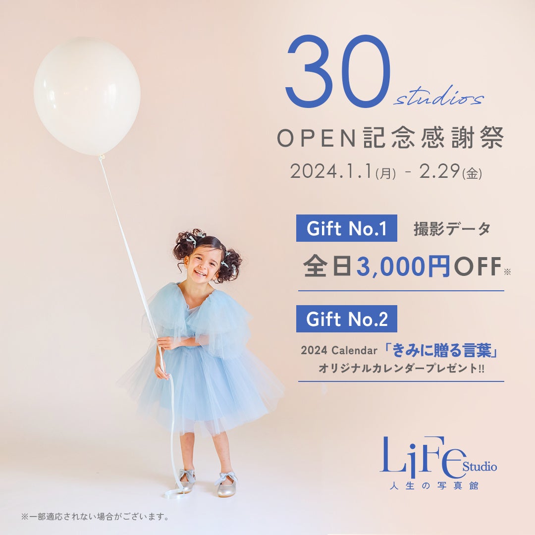 ライフスタジオ30店舗OPEN記念感謝祭 2024年1月2月は全日3,000円OFF!さらにオリジナルカレンダープレゼント。