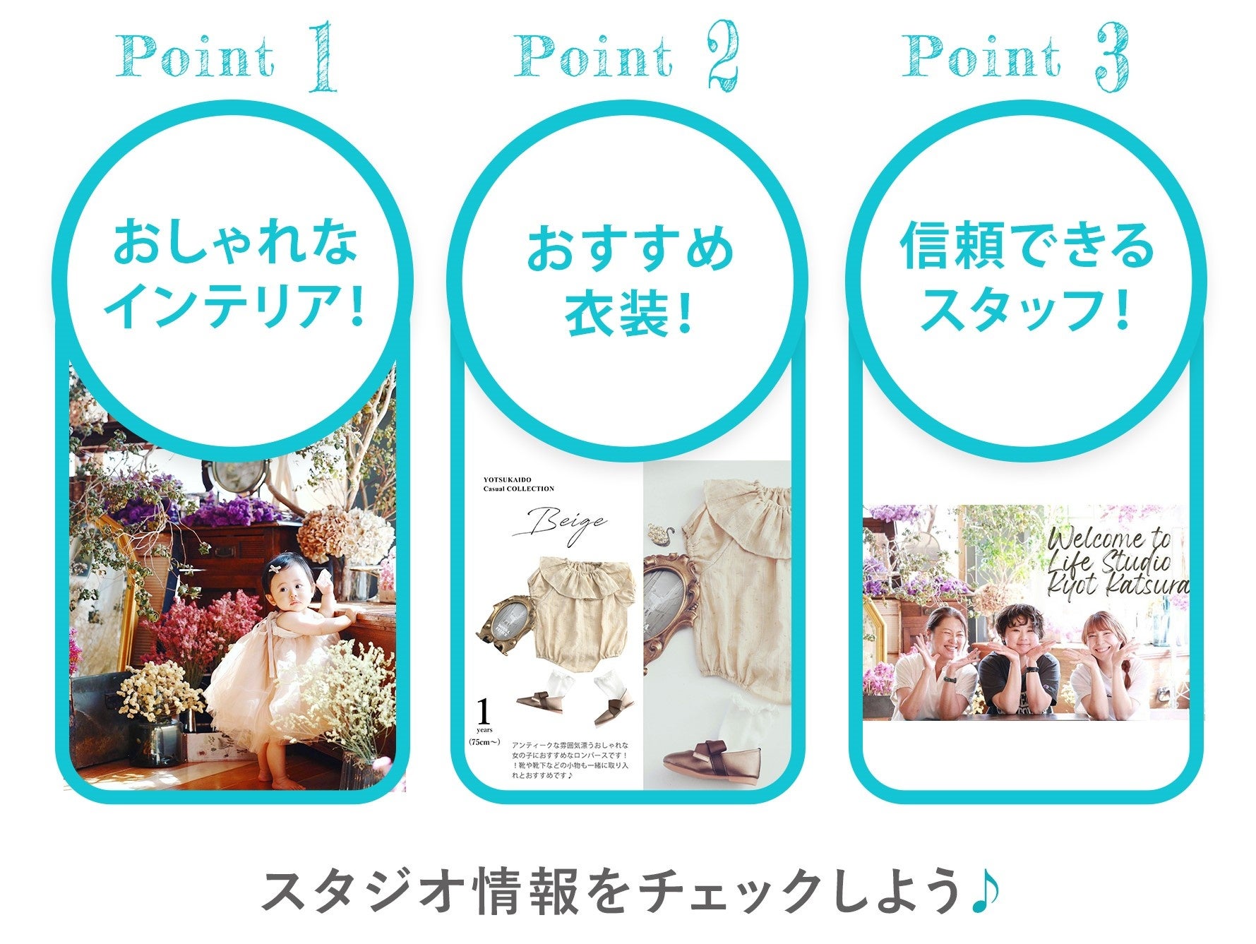 【美しさを表現し、思い出を記録する、楽しい遊びの空間】として、ベビー・キッズ・七五三・バースデー・入園入学・ハーフ成人式・家族写真・成人式・マタニティなど様々な記念写真を撮影、人生の様々なシーンで寄り添う写真スタジオ。ただ記録するだけじゃない、テーマパークにいったような思い出を写真スタジオで感じて頂けるように、一緒に遊びながら楽しく撮影を進めていきます。