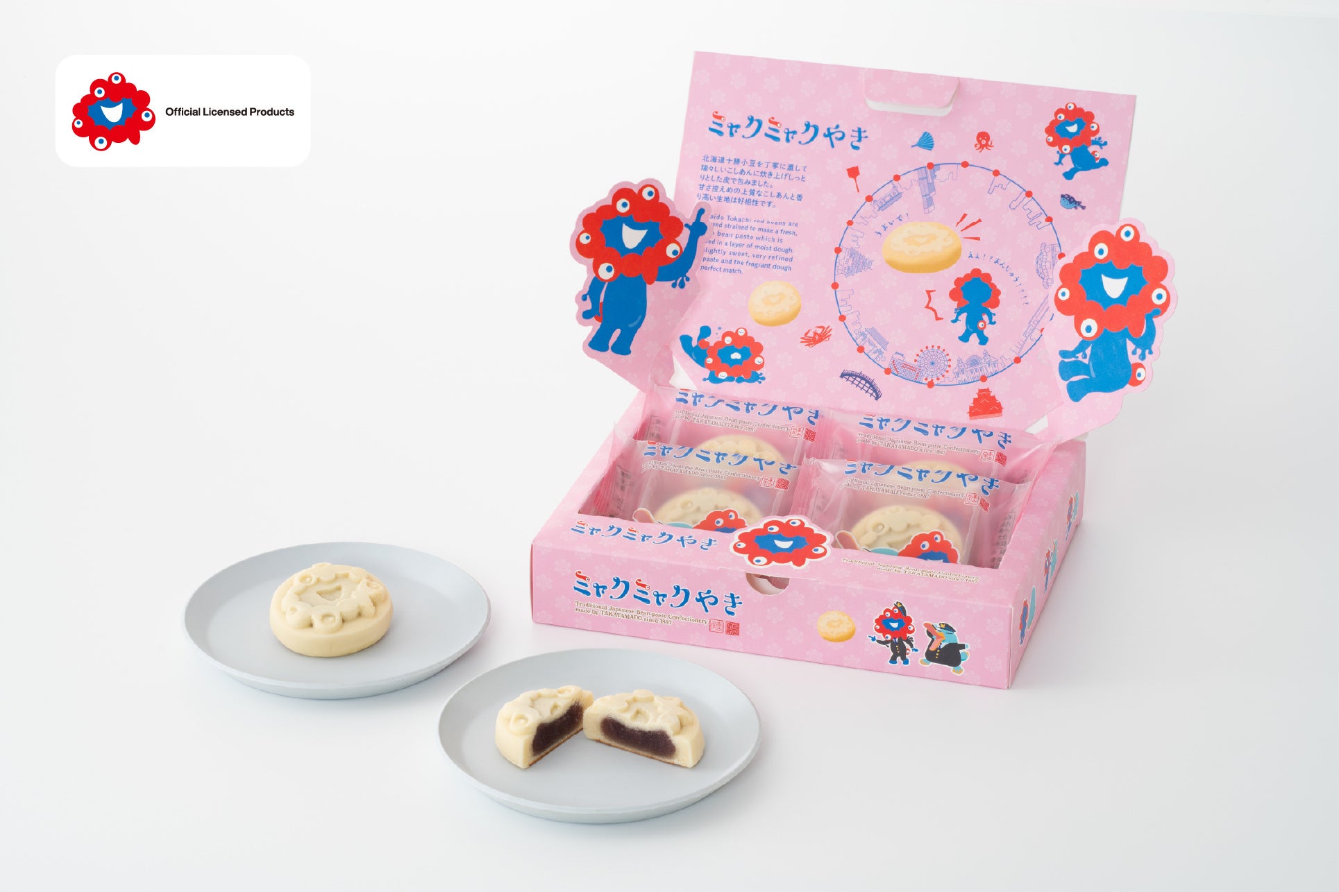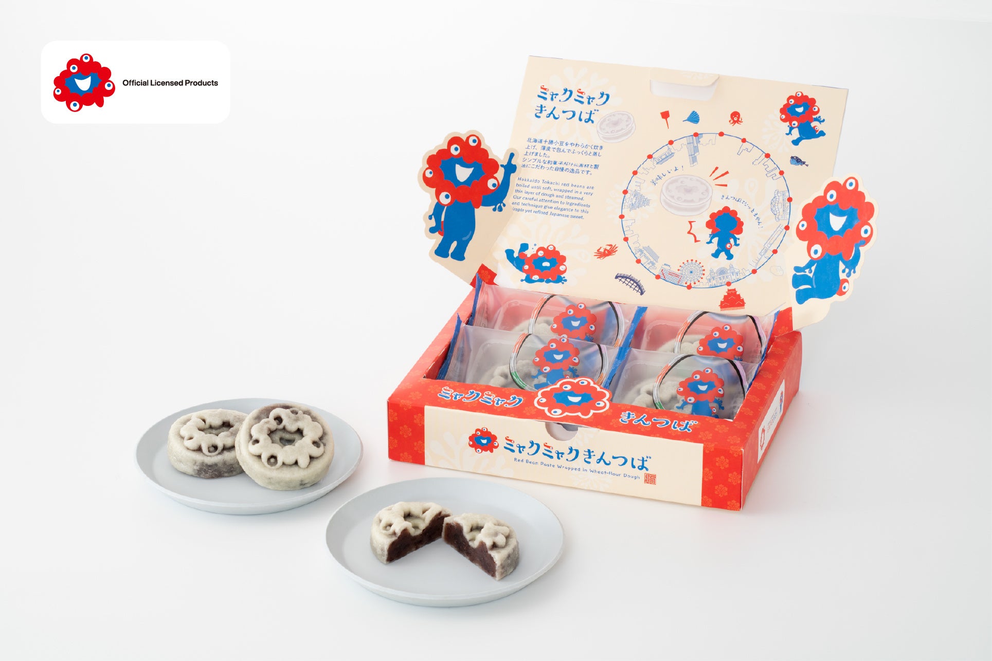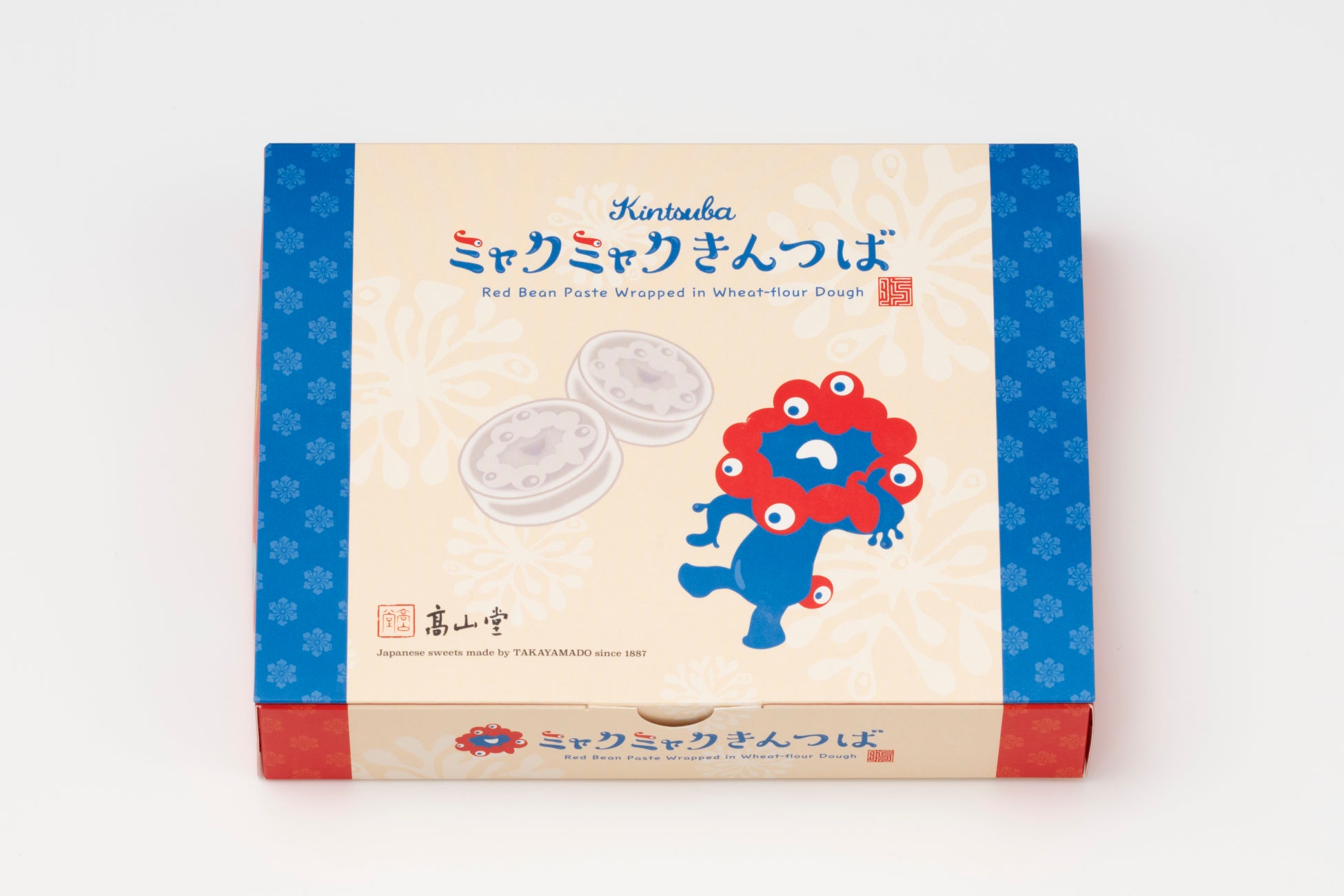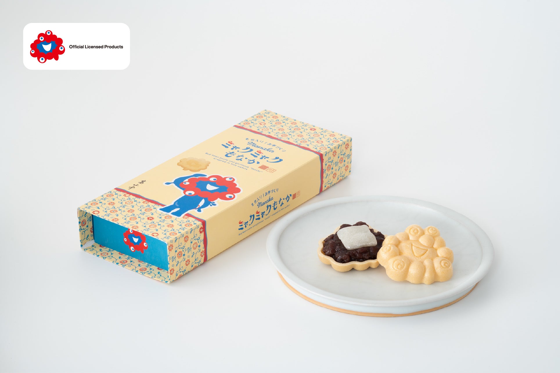 髙山堂でこしあんに使う北海道の指定品種だけを100%使用し炊き上げたこしあんは、なめらかな食感と共に、上質な小豆の風味が広がります。ミャクミャクのお顔を綺麗に表現するため、生地は「桃山」(ももやま)と呼ばれる伝統的な和菓子の技法でさっくり焼き上げました。