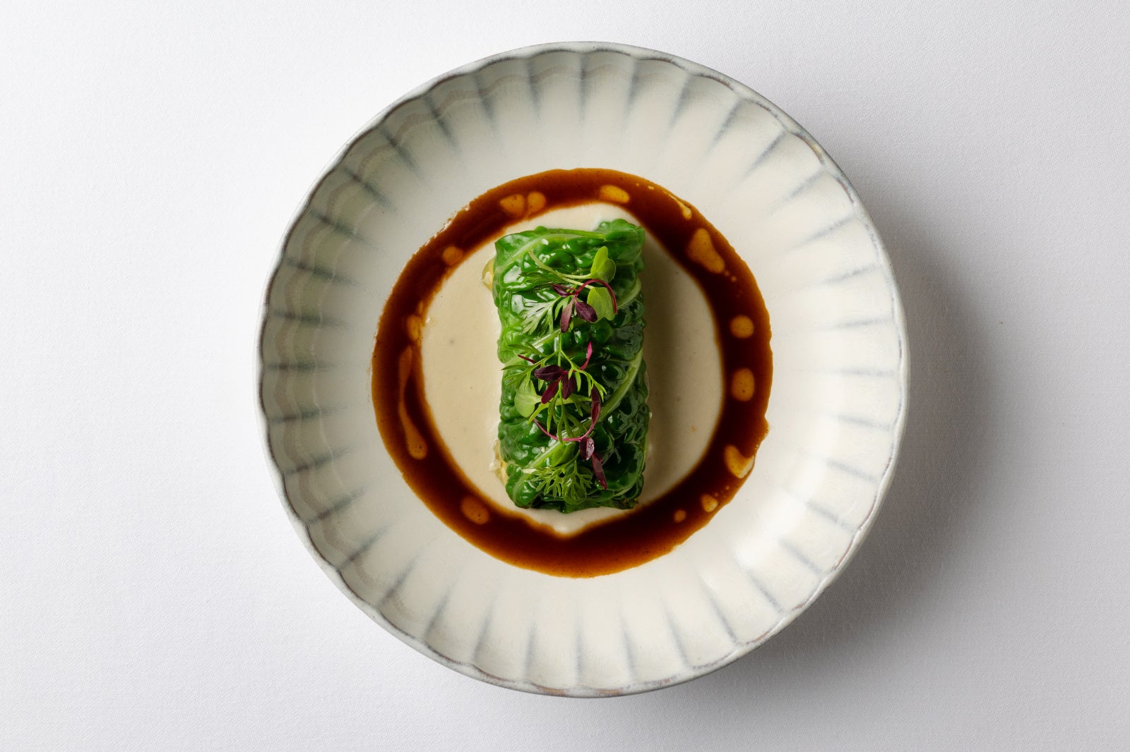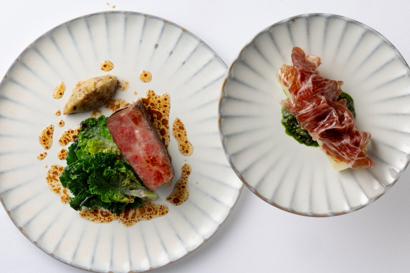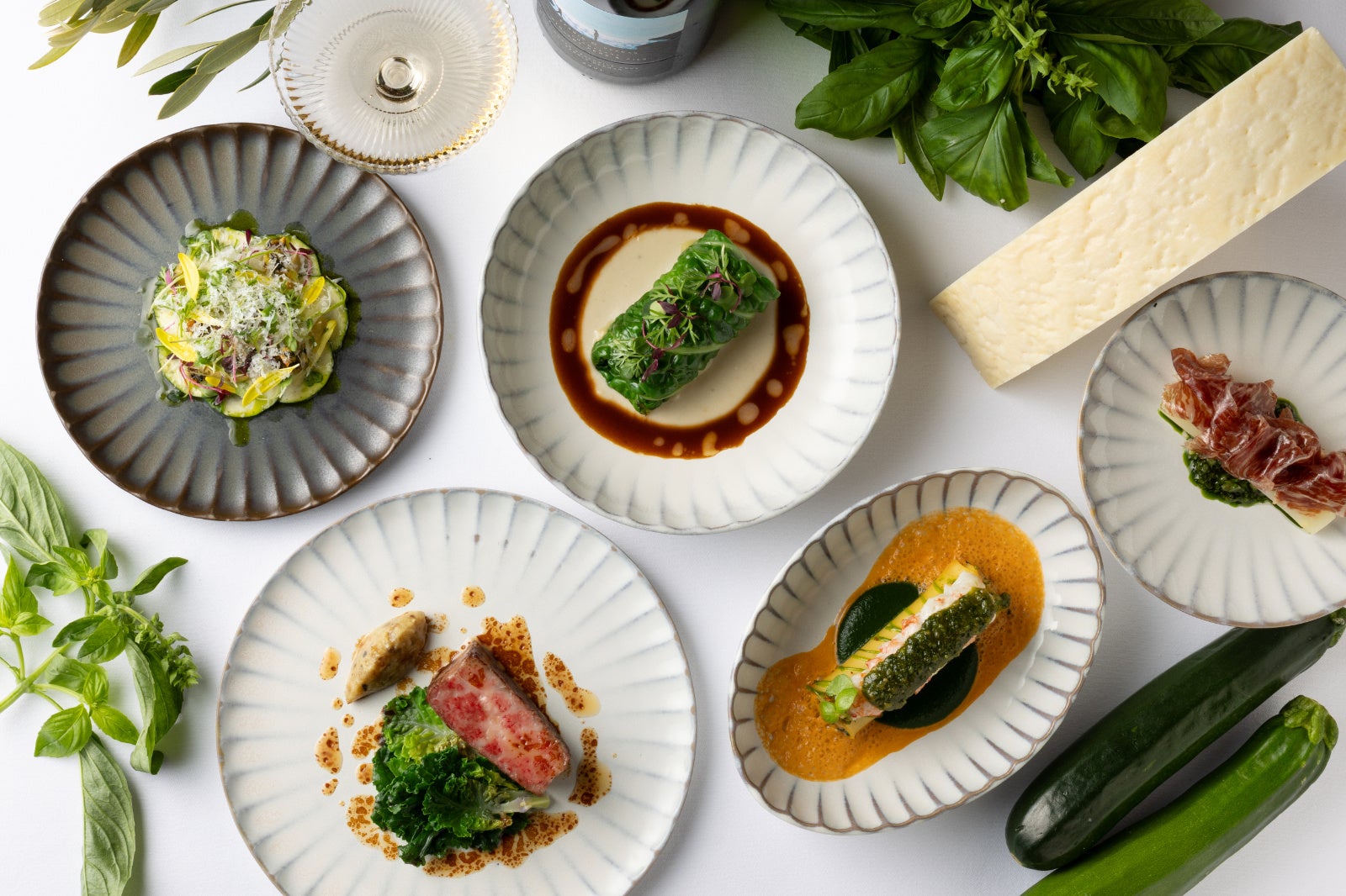 コースの一皿目には、トスカーナ州を代表する夏野菜ズッキーニの素材の旨味を堪能できる「ズッキーニのカルパッチョ」を。薄くスライスしたズッキーニに、アーティチョークの穏やかな苦味、ピスタチオのコク、グリーンオリーブの塩味を重ね、ペコリーノ・トスカーノで奥行きを添えました。コースのハイライト「カネロニ ペスト・ジェノヴェーゼ」は、リグーリア州に伝わる“乳鉢で丁寧にすり潰したバジル”の調理法からインスピレーションを得た一皿。セルジオは現地で伝統的な乳鉢と乳棒を作る職人と出会い、フレッシュなバジルを手作業でゆっくりとすり潰すことで初めて引き出されるバジルの繊細な香りと鮮やかな緑色に魅了されました。その体験から着想を得て、香り高いバジル、オリーブオイル、熟成チーズによるペストを中心に、リコッタと春野菜を包んだカネロニに、セルジオの故郷ゼーラントを想起させる甘み豊かな手長海老を重ねました。イタリア料理の伝統を受け継ぎつつ、セルジオならではの感性で昇華させた、ル・プリスティンのフィロソフィー“NEW ITALIAN”を体現する一皿です。続く、トスカーナの家庭料理を再解釈した「インヴォルティーニ」は、サボイキャベツで黒豚を包み込み、ローズマリーの香りとともに丁寧に仕上げ、代表的な食材である白インゲン豆のクリームを添えた一品。メインの「国産あか牛」には、トスカーナで祝いの席に供される牛肉文化から着想を得て、和牛ブレザオラと伝統的なハーブ香るグリーンソース“サルサヴェルデ”を合わせることで洗練された逸品へと昇華。旬のホワイトアスパラガスや発酵ニンニクと黒胡麻のアクセントが、イタリアと日本“二つの文化の対話”を感じさせる一皿です。デザートには、リグーリアの柑橘文化を思わせる「レモンのコンフィ」を。ストラッチャテッラのなめらかなジェラートに、柑橘の爽やかな香りとリグーリアでもよく使われる松の実のコクが溶け合い、地中海の陽光のような清涼感ある余韻を残します。さらに、エグゼクティブ ソムリエ 森 覚が厳選したトスカーナ州とリグーリア州をはじめとする世界各地のワインが料理に寄り添い、コース全体をより豊かな体験へと導きます。初夏の光が差し込む東京で、イタリアを旅するような唯一無二のガストロノミー体験をお楽しみください。