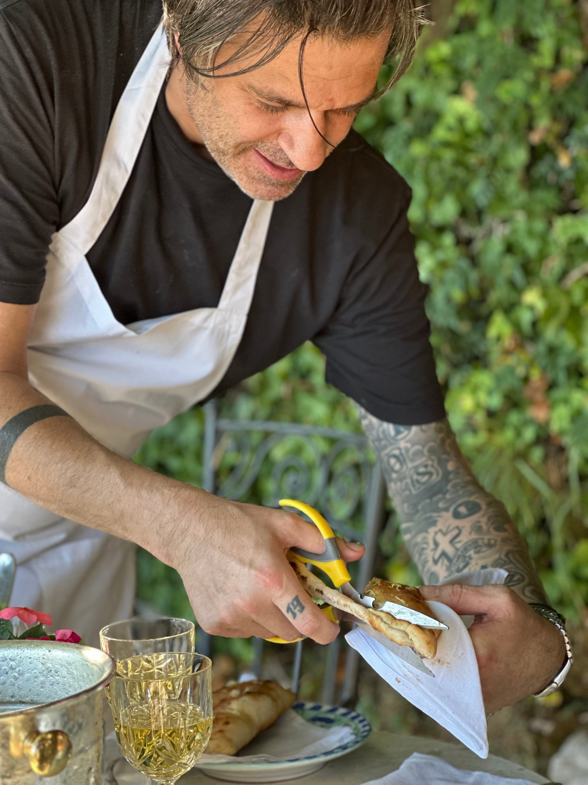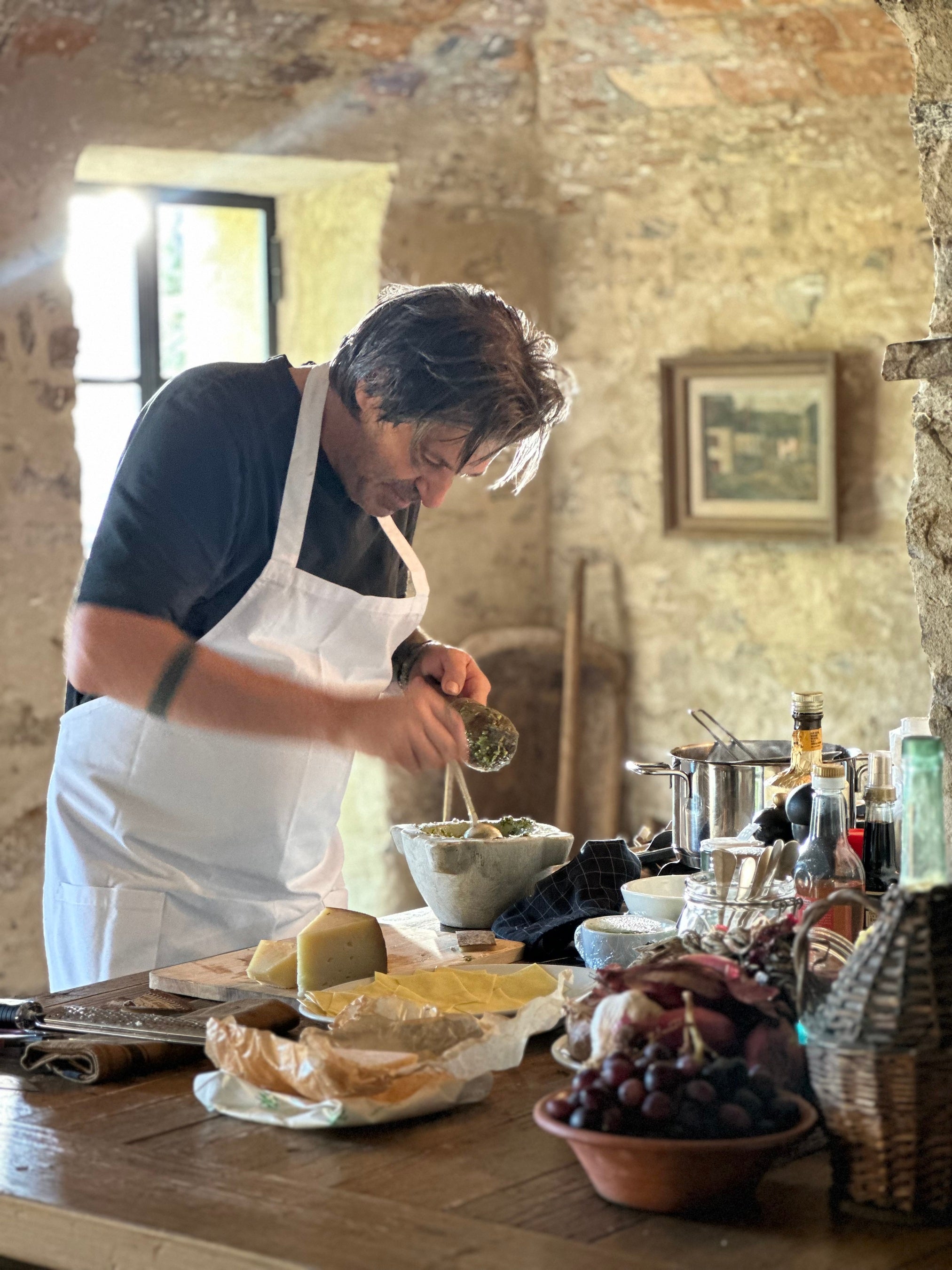 フィレンツェを中心に丘陵地帯が広がるトスカーナ州は、“クチーナ・ポーヴェラ(素朴な家庭料理)”の精神に象徴される土地で、大地で育った味の濃い野菜や豆、チーズなど身近な素材を活かしたシンプルな郷土料理の宝庫です。一方、チンクエ・テッレに代表される美しい海岸線を擁するリグーリア州は、海と山に挟まれた地形から、香り高いバジルなどのハーブや新鮮な野菜、オリーブオイルや魚介類を多用する軽やかな地中海料理が特徴です。セルジオが今回のコースで描くのは、そうした土地に共通する「素材を尊ぶ精神」。派手な技巧よりも野菜やハーブを料理の骨格として捉え、素材の純度と調和を引き出すことで、初夏にふさわしい軽やかなコースを構築しました。