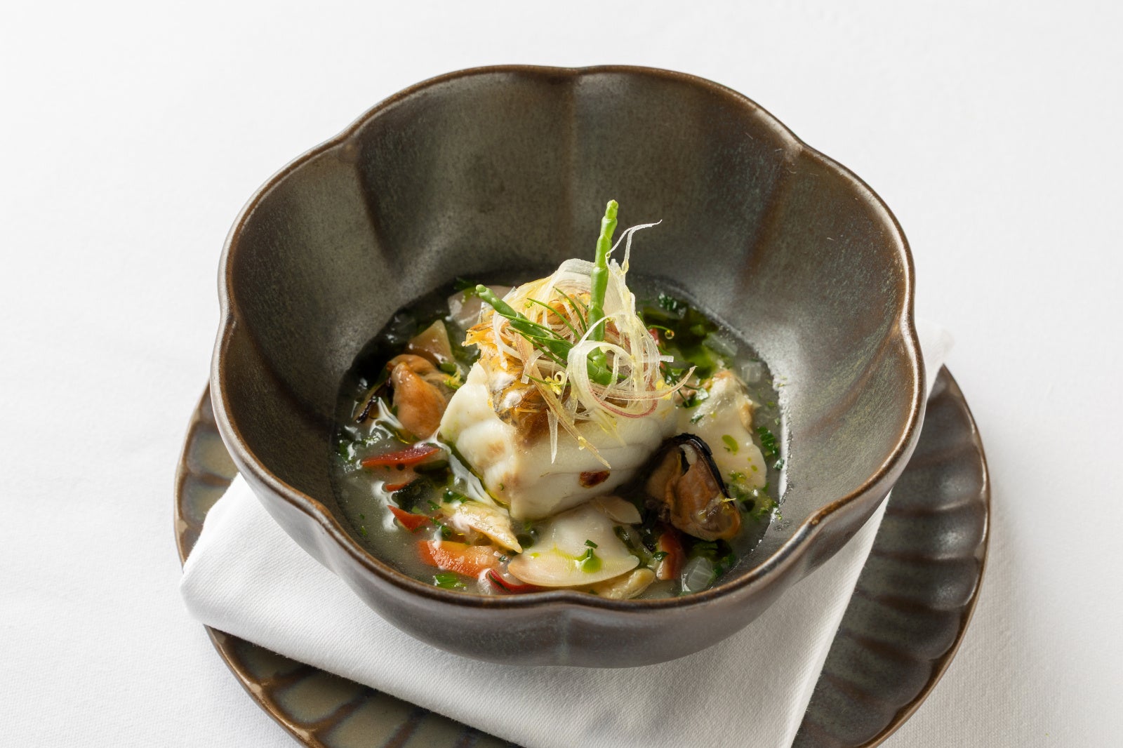 ◆スズキのクロッカンテ 貝のナージュ セロリ 茗荷 オリーブオイル