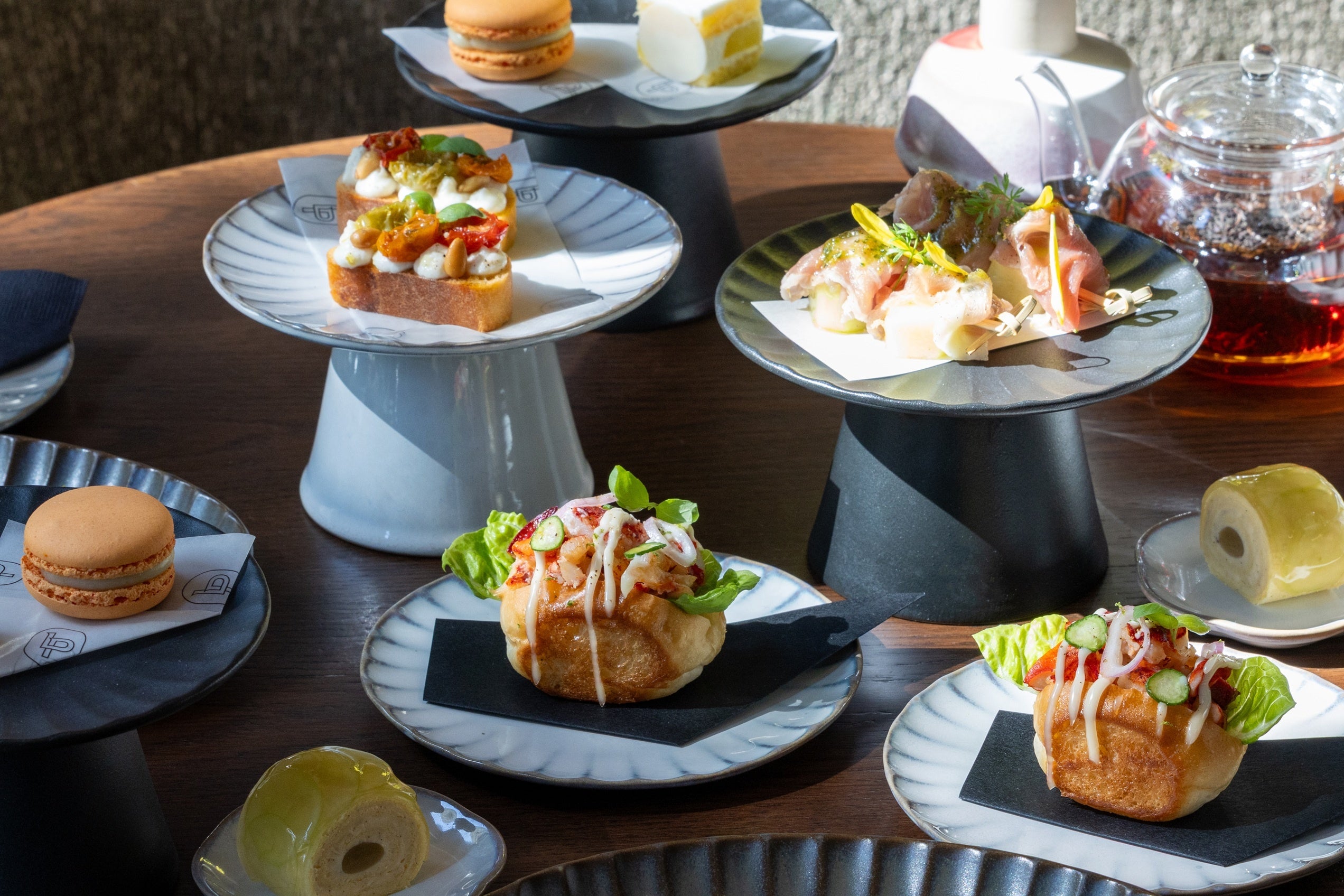 シェフこだわりのメインスイーツ「季節のクロスタータ」は、初夏の果実の魅力を異なる表情で描く2種をご用意。「シャインマスカットのクロスタータ」は、シャインマスカット特有の花のように華やかな香りと澄んだ甘みを引き立てるため、ホワイトチョコレートガナッシュに酒粕を重ね、ピスタチオの軽やかなコクと柚子の爽やかな和のアクセントを加えた、日本らしい奥行きのある上品な味わいに仕上げました。もう一つの「マスクメロンのクロスタータ」は、完熟メロンの芳醇な香りを主役に、軽やかなリコッタクリームとリモンチェッロの柑橘のニュアンスを重ねた一品。バジルの清涼感と松の実のやさしい甘みが絶妙に調和した、陽光を感じる初夏らしい軽快なデザートです。「季節のパスティッチーニ」には、夕張メロンの澄んだ甘さに、ほんのりローズマリーを効かせたガナッシュとプロセッコジュレを合わせた「夕張メロンのマカロン」など3種をご用意。セイボリーには、旬で濃厚なロブスターを贅沢に使用した「ミニロブスターロール」など3種が並びます。上品な甘みのロブスターにバジルやライムを効かせたクリーミーなブールブランが寄り添い、果実中心のアフタヌーンティーに心地よいリッチさを添えます。テラスに差し込む柔らかな光とともに、季節の移ろいを五感で味わう特別なアフタヌーンティーをご堪能ください。