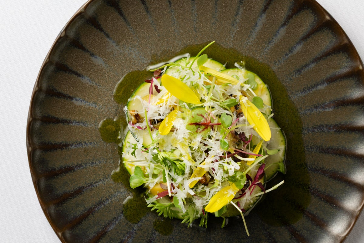 ◆ズッキーニのカルパッチョ アーティチョーク ピスタチオ ペコリーノ・トスカーノ バーベナ