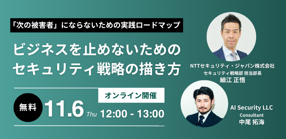 NTTセキュリティ・ジャパン株式会社(本社:東京都千代田区、代表取締役社長:関根 太郎)は、2025年11月6日(木)にAIセキュリティ合同会社(本社:東京都新宿区、代表取締役:堀居 隆生)と、「『次の被害者』にならないための実践ロードマップ~ビジネスを止めないためのセキュリティ戦略の描き方~」セミナーを共同開催します。