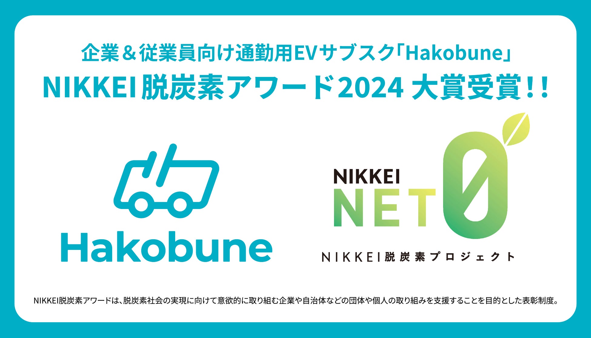 企業&従業員向けEVサブスクサービスを提供する株式会社Hakobune (本社:東京都千代田区、代表取締役社長:高橋雅典、以下「Hakobune」) が、日本経済新聞社主催「NIKKEI脱炭素アワード2024」において大賞を受賞したことをお知らせいたします。