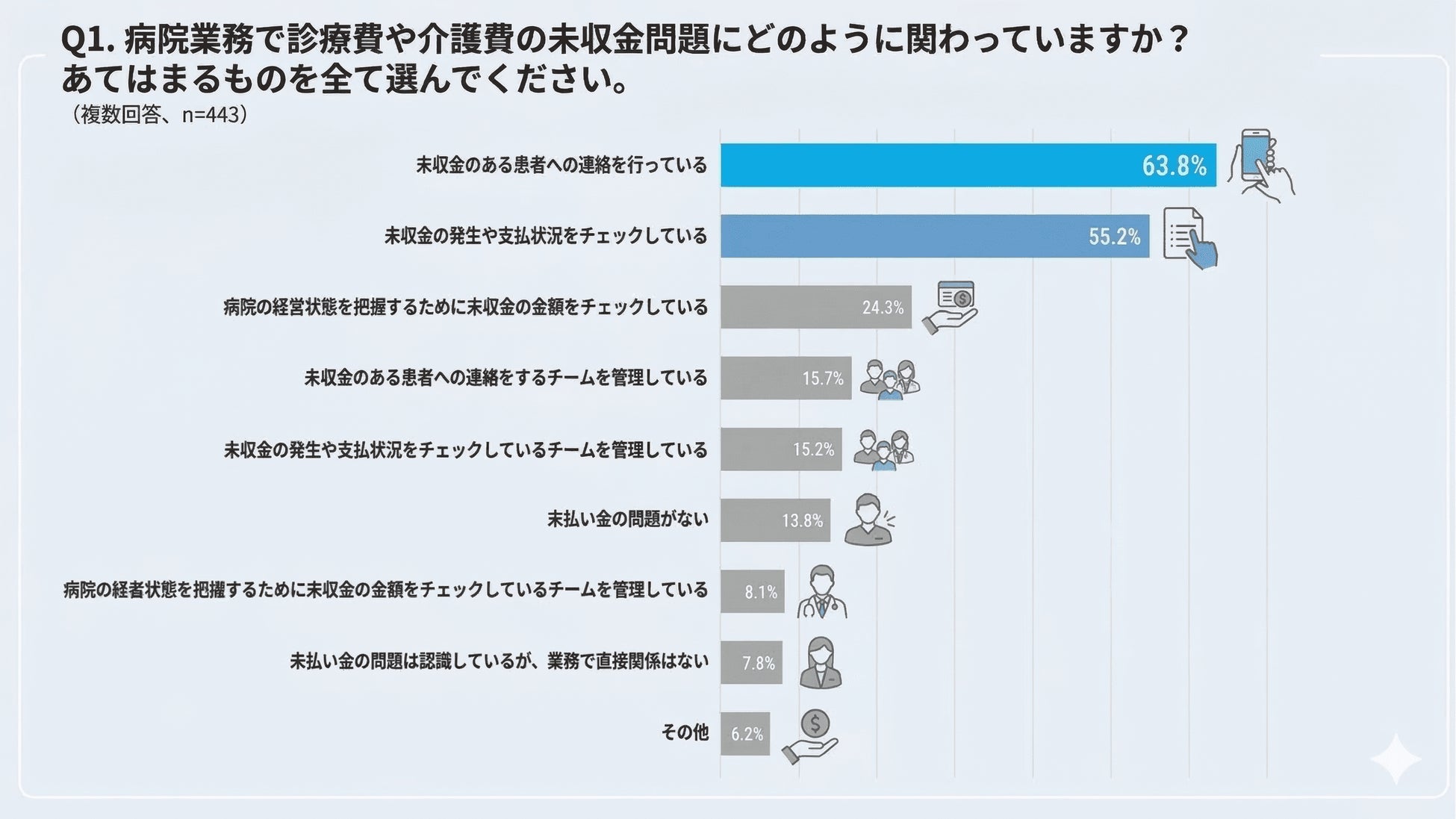 未収金問題への関わり方として、「未収金のある患者への連絡(63.8%)」が最多となりました。