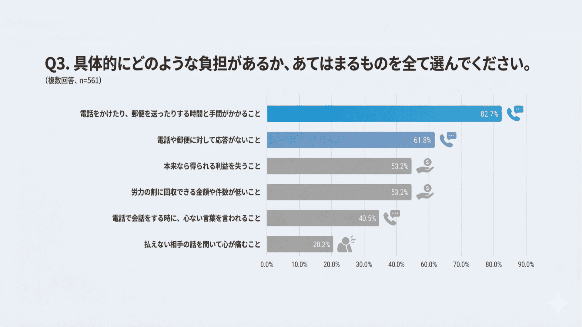 負担内容のトップは「電話や郵送の手間(82.7%)」、次いで「相手からの応答がないこと(61.8%)」でした。