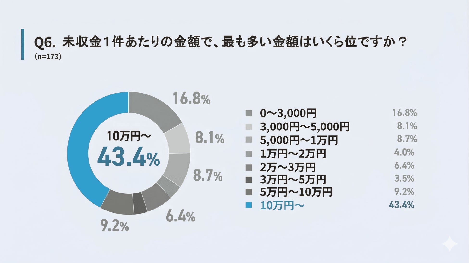 未収金1件あたりの金額は「10万円以上(43.4%)」が最も多い結果となりました。
