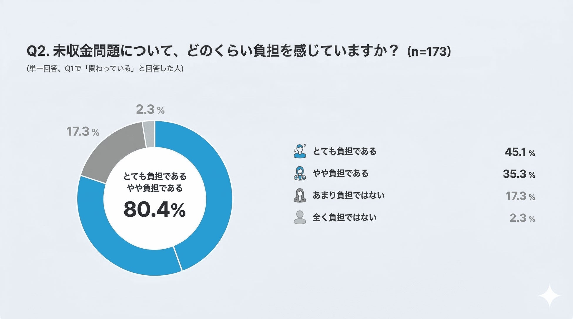 Q1で「業務に関わっている」と回答した担当者のうち、8割以上のスタッフが未収金対応を「負担(とても負担+やや負担)」と感じていることが分かりました。