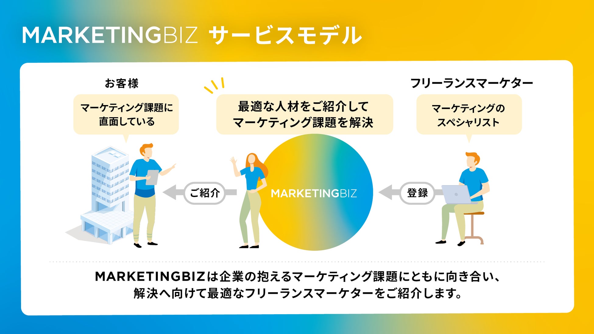 そしてこの度、深刻化する人材不足や市場環境の急速な変化に直面する企業のマーケティング課題に応えるべく、「フリーランスマーケターと企業をつなぐ」マッチングサービス「MARKETINGBIZ」をリリースいたします。