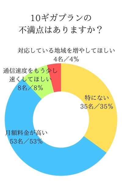 ・10ギガプランの不満点として最も多かったものは、月額料金の高さで53%だった。