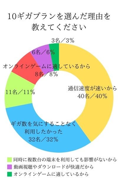 ・10ギガプランを選んだ理由として、最も多かったものは通信速度の速さで40%だった。