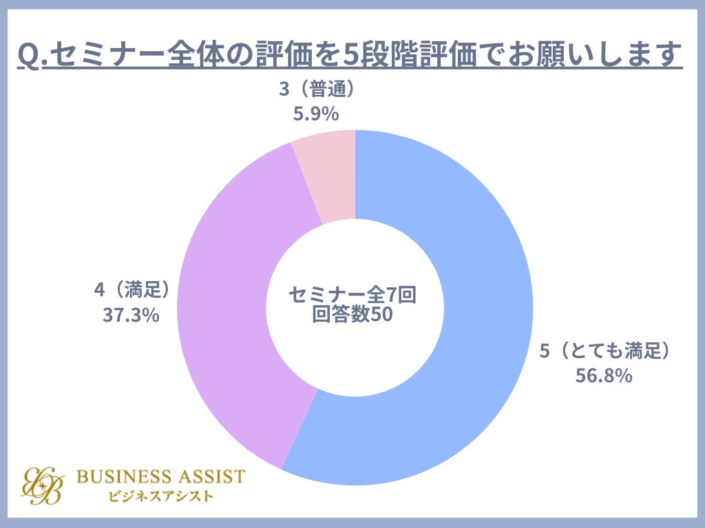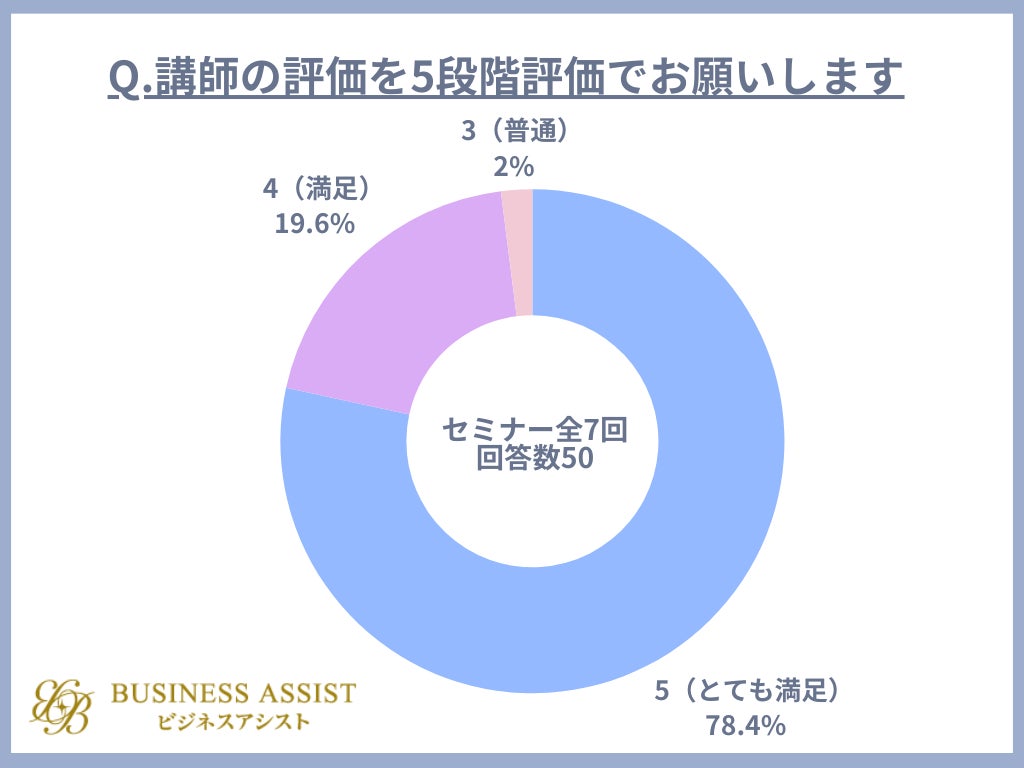 セミナー講師に対する評価では、5段階評価で「5(とても満足)」が78.4%、「4(満足)」が19.6%でした。