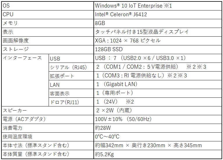 幅広い分野の様々な用途でご利用いただけるよう、OSには「Windows® 10 IoT Enterprise」 を採用しました。ソフトウェアやシステム構成により、POS端末としての用途だけではなく、セルフレジやタッチパネル端末としてもご採用頂けます。