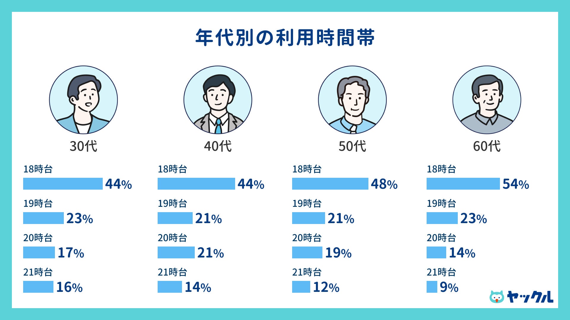 年代別の診療時間帯を見ると、どの世代でも18時台が最多です。特に60代では54%がこの時間帯に受診しており、仕事終わりの時間を有効活用できる利便性の高さがうかがえます。