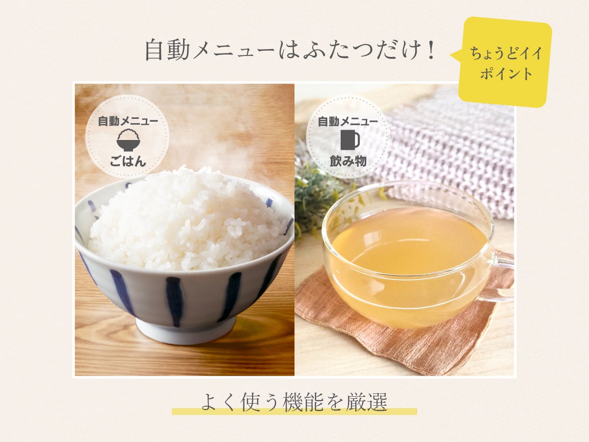 見やすく、ワンタッチ操作がしやすい大きめのボタンを採用。自動メニューには、よく使われる「ごはん」「飲み物」の2つを厳選し、シンプルな機能構成としました。