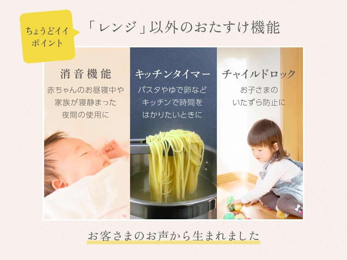 さらに、ユーザーの皆さまの声を反映し、消音機能やキッチンタイマー、チャイルドロックといった補助機能を備えています。