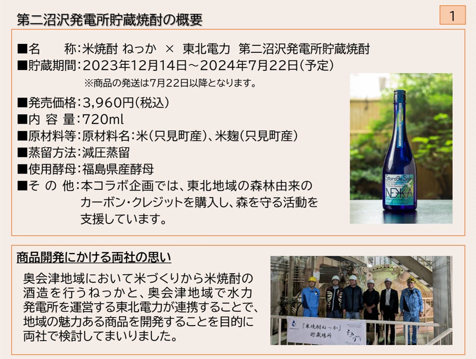 合同会社ねっか(福島県南会津郡只見町、代表:脇坂 斉弘、以下「ねっか」)と、東北電力株式会社(本店:宮城県仙台市、取締役社長 社長執行役員: 樋󠄀口 康二郎、以下「東北電力」)は、コラボ商品「第二沼沢発電所貯蔵焼酎」を企画いたしました。