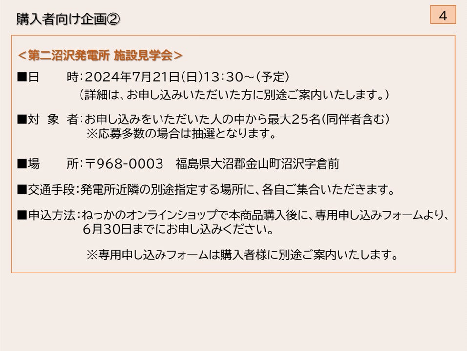 東北電力は、ご購入者様向けにNFT発電所カード※1を提供するとともに、本商品の貯蔵場所となった第二沼沢発電所の施設見学会にご招待いたします。