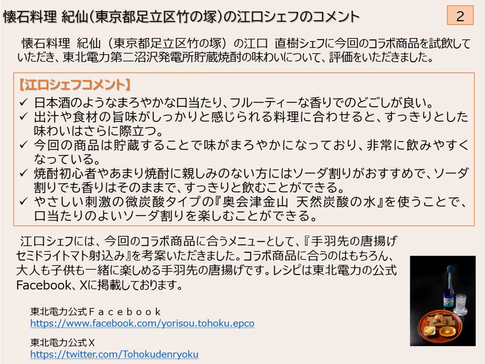 2023年12月から第二沼沢発電所内で貯蔵された本商品は、東京・竹ノ塚の名店「懐石料理 紀仙」の店主・江口直樹氏からも「まろやかな口当たり、フルーティーな香り、のどごしが良い。和食にもよく合う」との評価をいただきました。