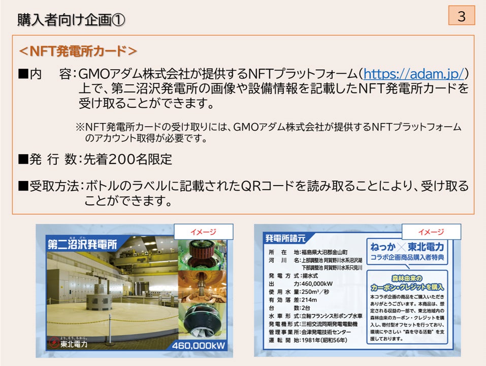 東北電力が提供するNFT発電所カードは、本商品のラベルに記載されたQRコードから受け取ることができ※2、普段立ち入ることができない第二沼沢発電所の写真などを掲載しております。