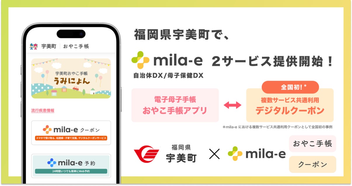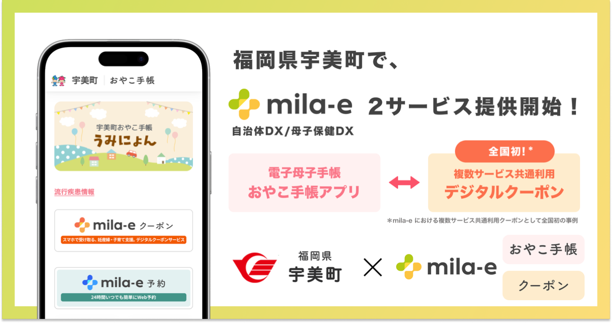 宇美町では、令和8年4月1日(水)から妊産婦応援事業を電子クーポン化し、国内で唯一、妊産婦応援事業の電子クーポン化に対応したシステム「mila-eクーポン」を導入します。