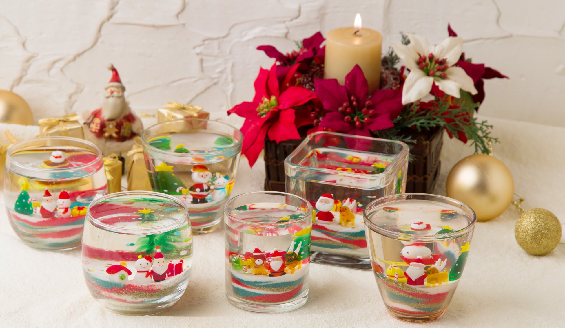 ガラス細工のクリスマスにまつわる様々なパーツとカラーサンドを使って「オリジナルキャンドル」が作れます。ゼリーのような感触の透明クリアジェルを使ったキャンドルです。