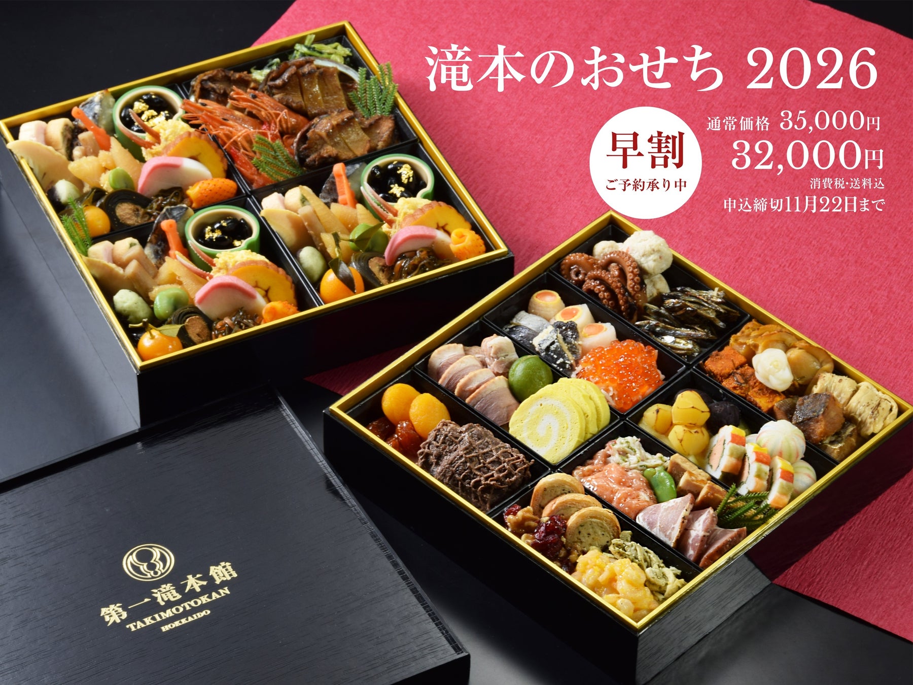 北海道登別温泉で165年以上の歴史を持つ老舗温泉旅館 第一滝本館(所在地:北海道登別市、代表取締役:南 智子)は、毎年ご好評をいただいておりますお家で楽しむ「滝本のおせち2026」のご予約受付を2025年8月15日より開始いたします。