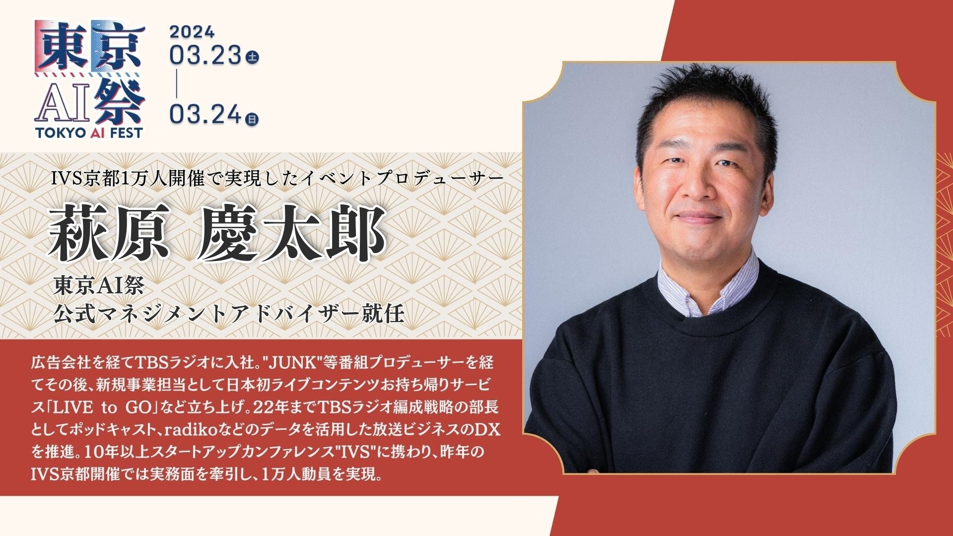 2024年3月23日(土)、24日(日)に渋谷ストリームホールにて開催される「東京AI祭」のマネジメントアドバイザーに、日本最大級のスタートアップイベント「IVS」で長年ドバイザーを務め、昨年の京都開催時に参加者1万人を動員した際にはイベントオペレーションを企画・統括した、萩原慶太郎氏が就任いたします。