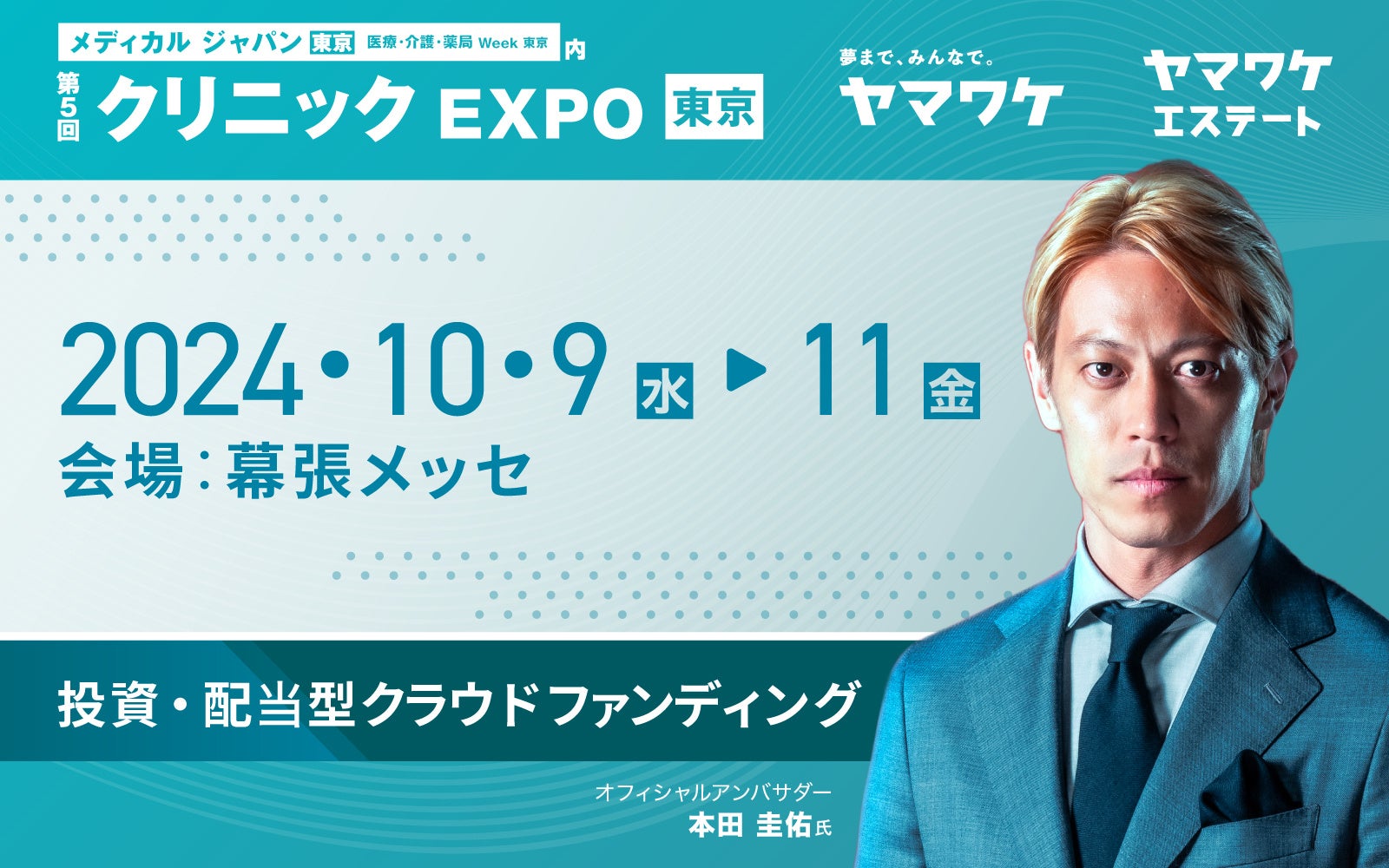 ヤマワケエステート株式会社(本社:大阪府、代表取締役:芝 清隆)と親会社であるWeCapital株式会社(本社:東京都港区 代表:松田悠介 、橋口遼)は、2024年10月9日〜11日に幕張メッセで開催されるメディカルジャパン内の「第5回 クリニックEXPO」に「ヤマワケエステート」及び「ヤマワケ」のブースを共同出展いたします。