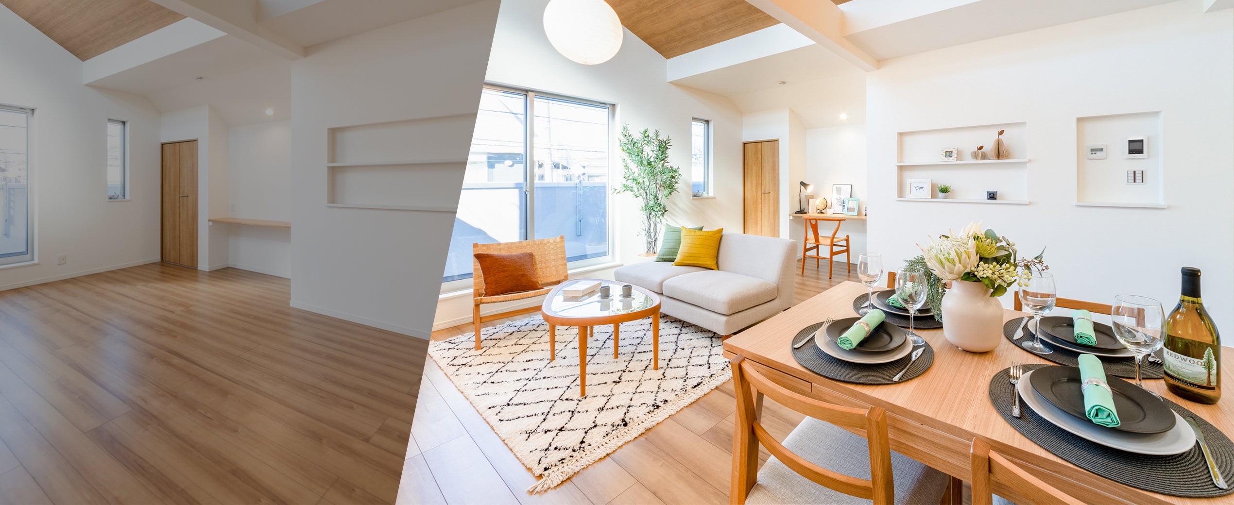 空室のままでは伝わりにくい生活シーンを、家具やインテリア小物で演出することで、物件本来の魅力を最大限に引き出します。