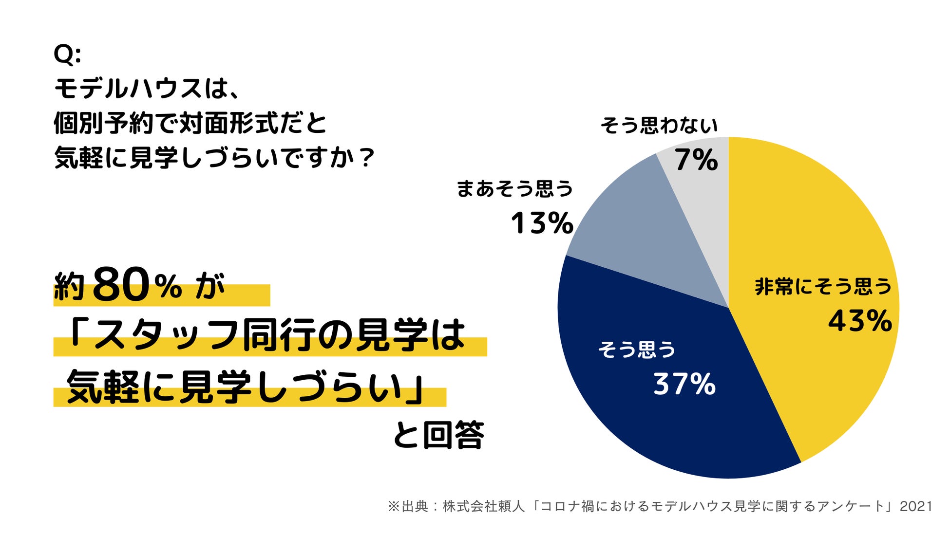 また、モデルハウスの見学に関する調査では、約80%が「スタッフ同行の見学は気軽に見学しづらい」と回答しており、購入検討者が自分のペースで物件を内見したいというニーズも明らかになっています。