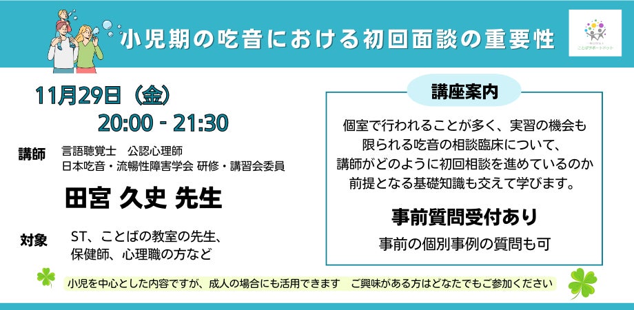 この講座では、基本的には小児を中心とした吃音の初回面談についての内容を扱う予定ですが、成人の場合の面談にもご活用いただけます。ご興味がある方は、どなたでもご参加ください。