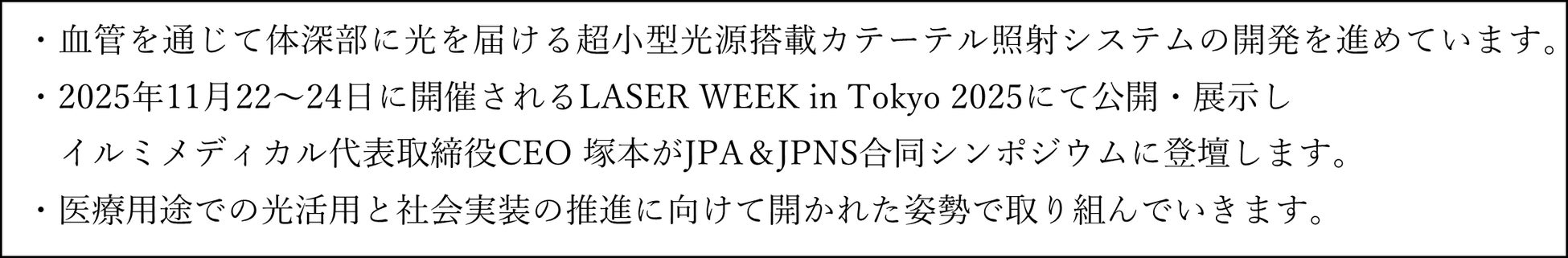 体深部での光活用という新たな医療領域の確立に向けて、興味をお持ちの方はぜひLASER WEEK in Tokyo 2025(2025年11月22〜24日)にて、イルミメディカルの展示・発表にアクセスいただき、直接ご意見・ご関心をお寄せください。