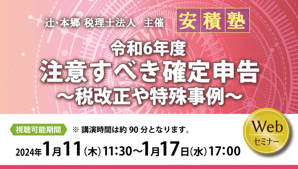 辻・本郷 税理士法人(本社:東京都新宿区、理事長:徳田孝司)は、2024年1月11日(木)より「【安積塾】令和6年度 注意すべき確定申告~税改正や特殊事例~」セミナーを開催いたします。今回の確定申告から影響が生じるものを確認し、開業、廃業、資産損失など、イレギュラーな事象を中心に取り上げ、留意すべき点について解説します。借入金の利子や租税公課の取扱いなど、基礎的な論点も必要に応じて確認します。また、有価証券や取得価額が不明な不動産の譲渡について等、特殊事例についても触れ、ご説明します。