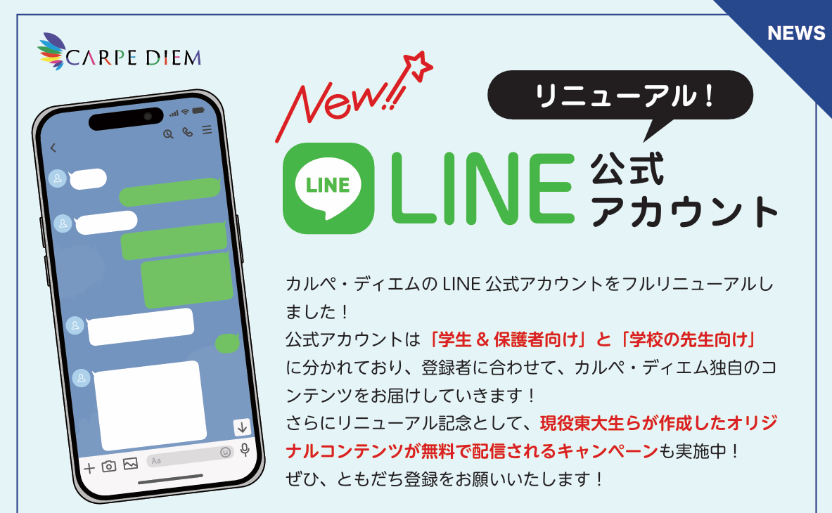 現役東大生を中心に、教育支援事業等を行う株式会社カルペ・ディエム(代表者:西岡壱誠 所在地:東京都中央区)は「最新の学習ノウハウと学校現場の先進事例をより身近に届けるため」に2025年6月30日より公式LINEをリニューアルいたしました。