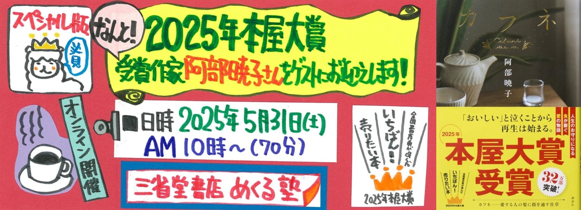 今回の読書会は特別企画です。話題作『カフネ』で第22回本屋大賞受賞した阿部暁子さんご本人をお迎えして創作の裏話や、まだ熱気も冷めやらない本屋大賞の舞台裏の体験談をメインに書店に対する想いにも迫ります。