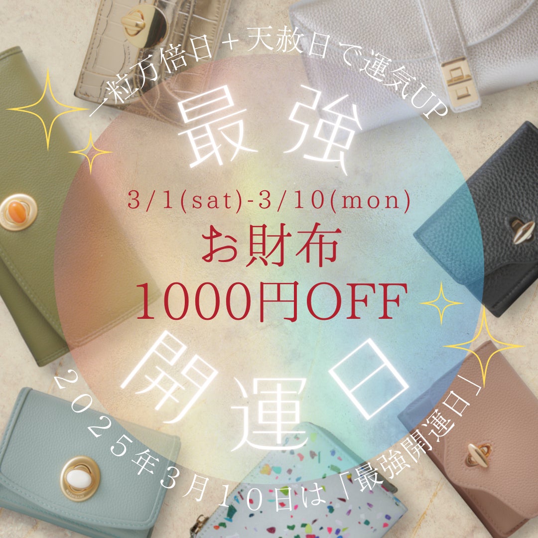 小さいアイテムだからこそ楽しめるキラキラした世界観を詰め込んだ新作アイテムが最強開運日に合わせて入荷。公式オンラインストアでは、3月10日(月)までお財布全品1,000円OFFタイムセールを開催。