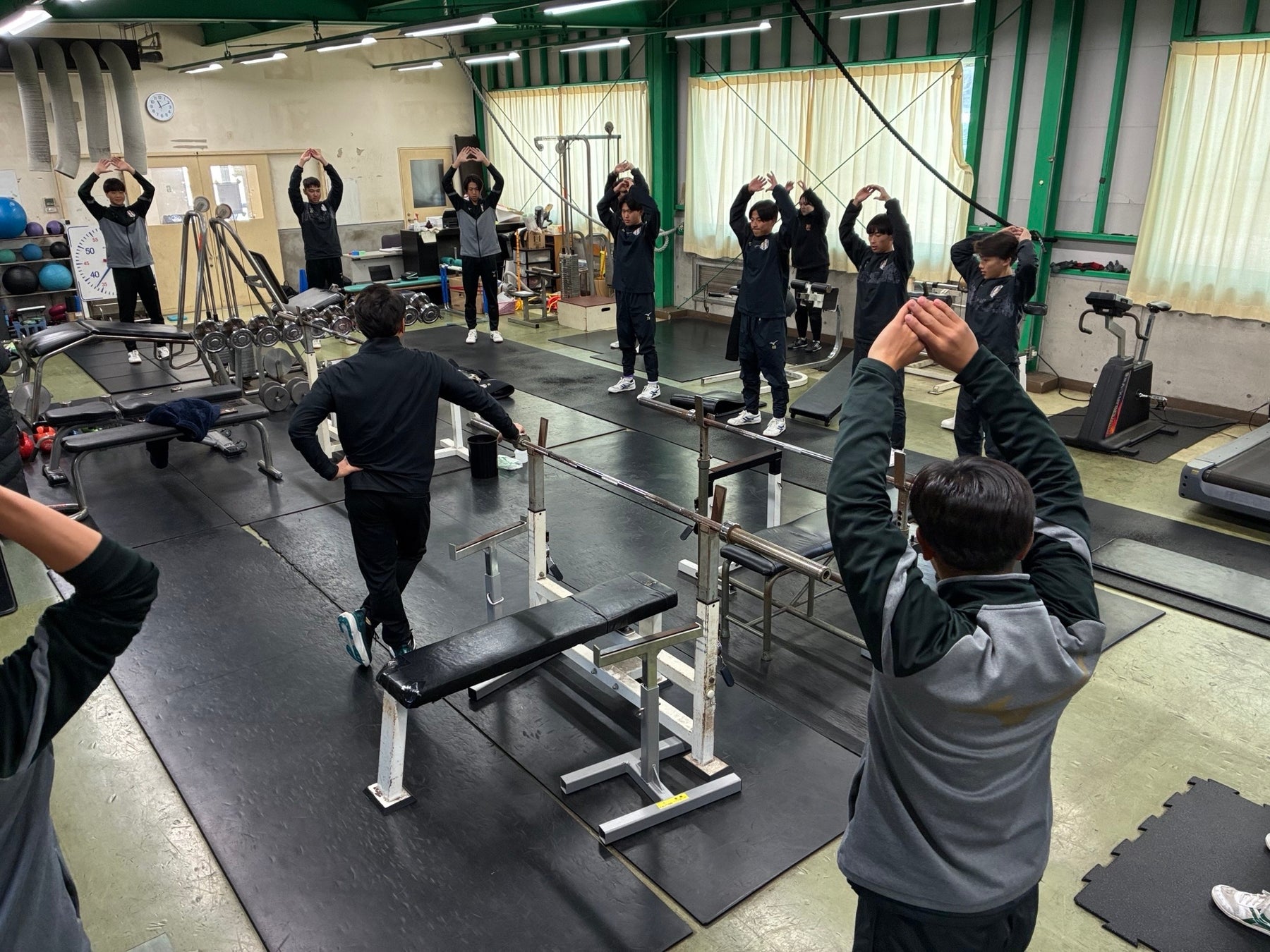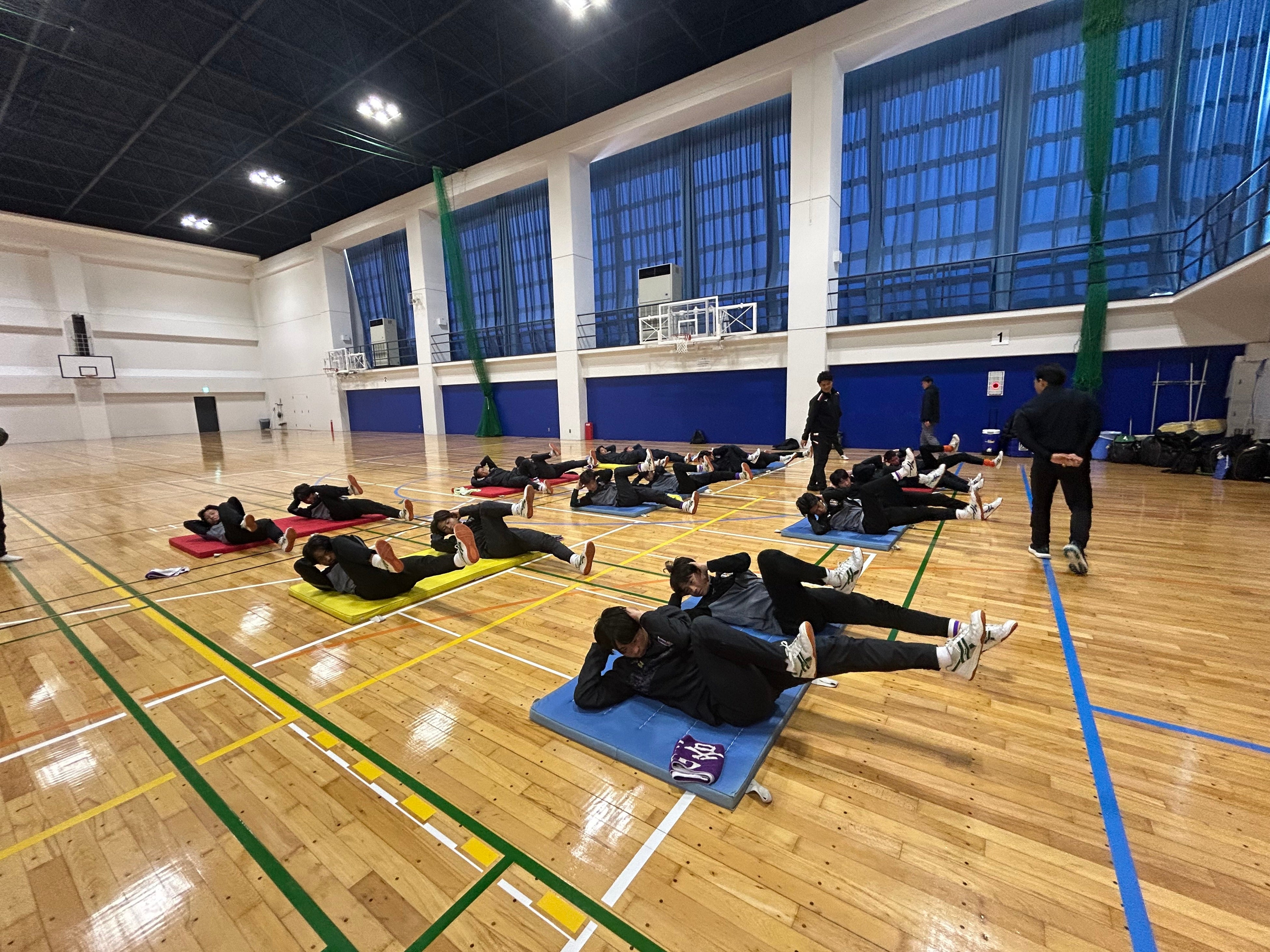午後は、日本福祉大学付属高校体育館アリーナにてトレーニングを実施。呼吸法から始まり、アライメント、ドローイン、ダイナミックストレッチ、ストレングストレーニングなど、身体の使い方を意識したプログラムが行われました。選手たちは熱心に取り組み、専門的なトレーニングを通して多くの学びを得ました。