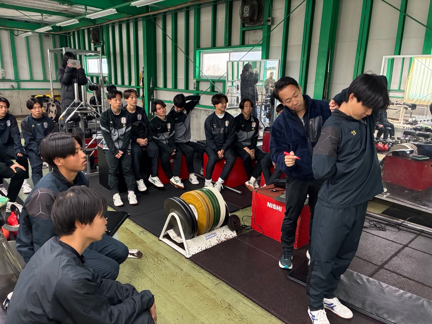 午前は日本福祉大学トレーニングルームにて、呼吸法の指導を受けるとともに、ジャンプ力測定を全選手が体験しました。また、スクワットやプッシュアップなど、身体づくりの基礎となる5つの基本動作について実践的な指導を受けました。