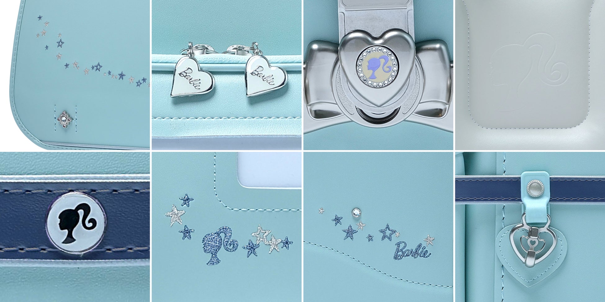 「ミルキーウェイ」は、シンプルで洗練されたフォルムの中に、バービーらしい遊び心を加えたデザインが特徴です。本体カラーとマチベルトをツートーンにすることで、ランドセル全体に立体感と奥行きを持たせています。かぶせ部分やサイド、前ポケットに星の刺繍が施されており、前ポケットのチャームはバービーハート。「くるピタ® ハート バービー」錠前と合わせて、華やかさを演出しています。
